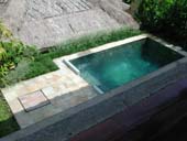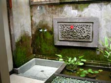 ![]() バスルームは半屋外。ここにも花がそえられている。 シャワーの横の小さな池には金魚が |