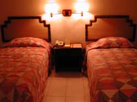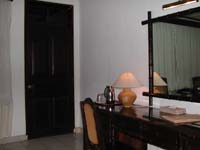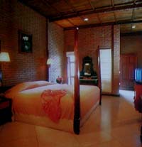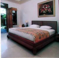 | 2002年11月2日宿泊 ングライ空港に迎えにきてくださったのは、ニコニコ顔のワヤンさんだった。 ジンバランにある「プリ・バンブー・バンガロー」までは車で10分ほど。 空港までの無料送迎つきです。 海辺にずらっと並んだシーフードレストランまでは歩いてすぐという、 ジンバランを楽しむのには絶好の場所。 スタッフはみなさんとても親切で気持ちがいい。 スタンダードのお部屋は BALI HEATさん 予約値段で US$35(アメリカンブレックファーストつき) と、リーズナブル。 そのわりにツインのお部屋はとても広くてゆったりしています。 飲料水はポットにはいっています。 アメニティは歯ブラシはあったけど、シャンプーが1袋しかなく、コンディショナーはなし。 お風呂場も広いのですが、古いホテルらしくシャワーの先がとれちゃって大あわて。 でもここのホテルの美術品はバグース!! 写真に写っていなかったのが残念ですが、部屋に飾ってあったブンゴセカン調の 絵はすばらしかったです。 部屋の外にも惜しげもなくすばらしい絵がかかっています。 ベッドの上部の壁にも手の込んだイカットが飾ってありました。 竹と木を組合わせたシックなインテリアがとても落ち着きます。 各部屋に小さなベランダがあり、プールが目の前です。 部屋のタイプは他にスーペリアとデラックスとビラタイプがあり、 それぞれインテリアが違ってステキです。 |