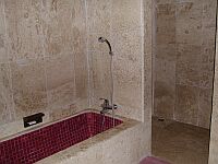 違います。 お部屋の真ん中にダブルベッド、これもカラフルなベッドカバーがかわいいです。 壁は木で、全体に明るい感じ。 バスルーム、シャワールームは大理石でとても広いです。 ただ私が泊まった部屋は1階でガラス戸だったのでちょっとプライバシーが 心配でした。 部屋の料金は、BALI HEAT さん料金で、アメリカンブレックファースト付き、 税込みで、スタンダード US$40、スーペリア US$60、デラックス US$95 でした。 料金的にもお部屋の雰囲気でも、私はスーペリアがお勧めです。 |
