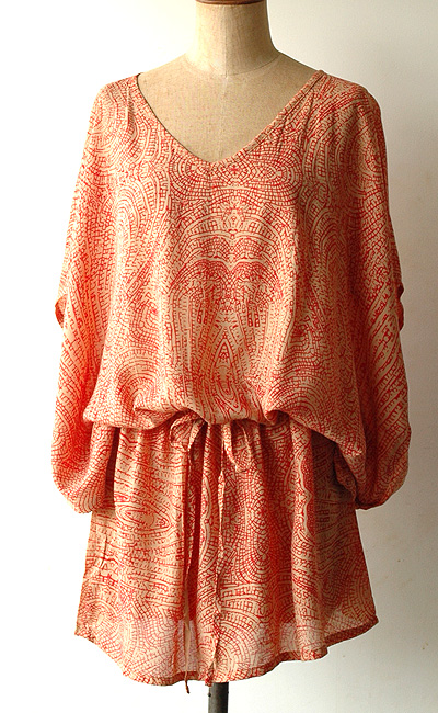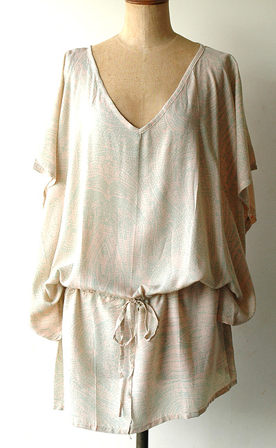 肩の縫い目がなく、四角い布をV字に襟ぐりをあけて、ローウエスト切り替えでブラウジングします。 着物のような袖は、途中まで縫い留められて、袖口になっています。 柔らかい布でたっぷりゆとりがありますので、スタイルがカバーされます。 ブラウジングの位置はウエスト付近でも良いですし、ほとんど絞らないで、ゆったりとブラウジングするのもいいですね。 薄手のレーヨン100%が2型、1型はコットンの混紡です。 デコルテラインが美しく見えるV字開きですが、 アンダーにタンクトップなどを着ると安心です。 キャミソールはこちら ![]() |