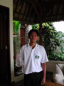 それぞれにリビング、キッチン、ベッドルームが3つ、プライベートプールがあります。 6〜8名でにぎやかに泊まるのにはぴったりです。 希望があればスタッフがプールサイドでバーベキューもやってくれますよ。 とってもハンサムぞろいのスタッフは17名、一流のサービスです。 レストランはなく、ビラのキッチンで調理してくれます。 またはバタンワルとかのカフェからデリバリィしてくれます。 ただし、これはセットで4人前以上なので食費は結構高くつくかも。 |