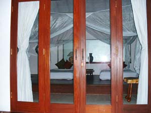 2004年11月23日、小さな村の田園風景の中を車で走っていると、突然白い石畳が現れる。 長いくねった石畳を進むうちにクラチャイの世界に入り込んでいく。 大きな吹き抜けの開放感のあるロビーで、スタッフに迎えられた。 私が訪れた日はあいにく全部のお部屋がうまっていたので中にははいれない。 それでも今回特別に2ベッドルームヴィラの1つを外から見せていただいた。 |