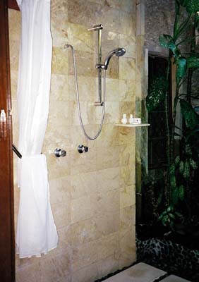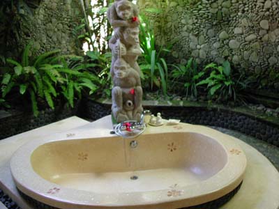 | バスタブは半屋外。おさるさんの彫刻に見守られて。 | アメニティも充実、入れ物がかわいい。 | バスタブの横に、シャワーも半屋外。 |