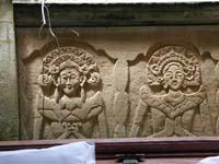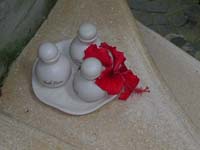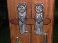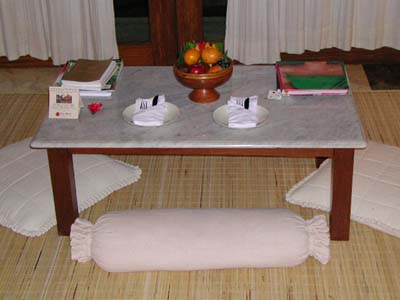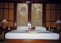 | キングサイズのwベッドの上にはおみやげのサロンが置かれています。 | ベッドの上のカマサンスタイルの絵のとびらをあけると、外には こんな彫刻が | 大理石のテーブルの上にはウェルカムフルーツが。 | お庭に出るガラス戸のかん。思わず笑っちゃいます。 |