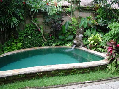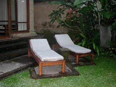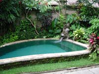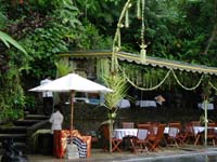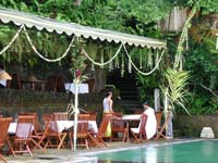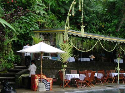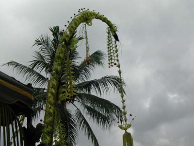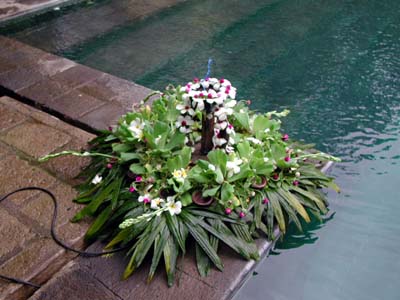 | プールサイドで結婚式のセレモニーの準備が始まりました。 お飾りは全部手作りです。バリの人は器用ですね。 | 竹で作られたベンジョール、高くそびえたっています。 | ||
